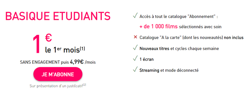 Ainsi, peu importe votre âge, si vous pouvez justifier le statut d’étudiant (un document sera demandé), vous pouvez bénéficier du catalogue de plus de 1000 films sur votre player Pop ou mini 4K ainsi que sur d’autres écrans (mobile…) pour 4.99€/mois, avec un premier mois à 1€, sans engagement.