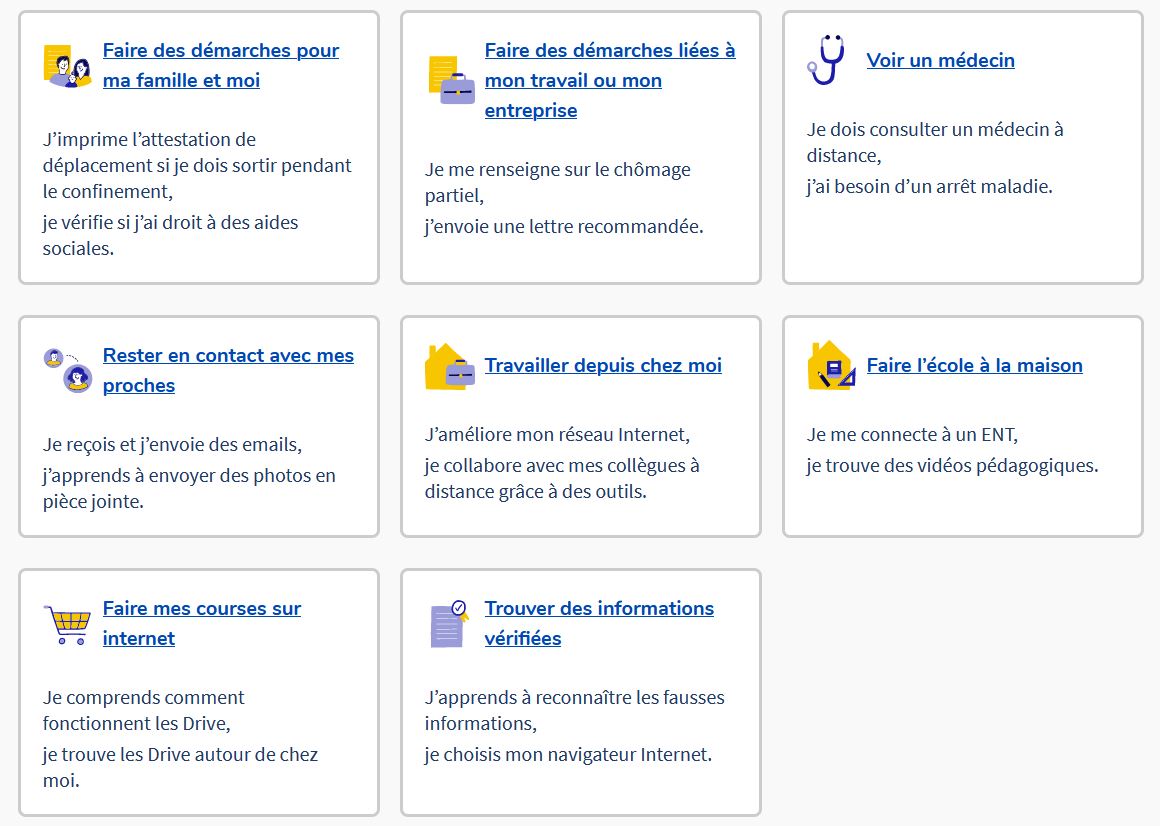 Plusieurs solutions pour réaliser ses courses en lignes sont également proposées et bien d’autres problématiques sont couvertes pour permettre même à ceux qui ne connaissent que très peu le monde du numérique de réaliser de nombreuses démarches en ligne. Et si le site n’est pas clair, un numéro a également été mis en place pour joindre une assistance en direct, du lundi au vendredi, de 9h à 18h.