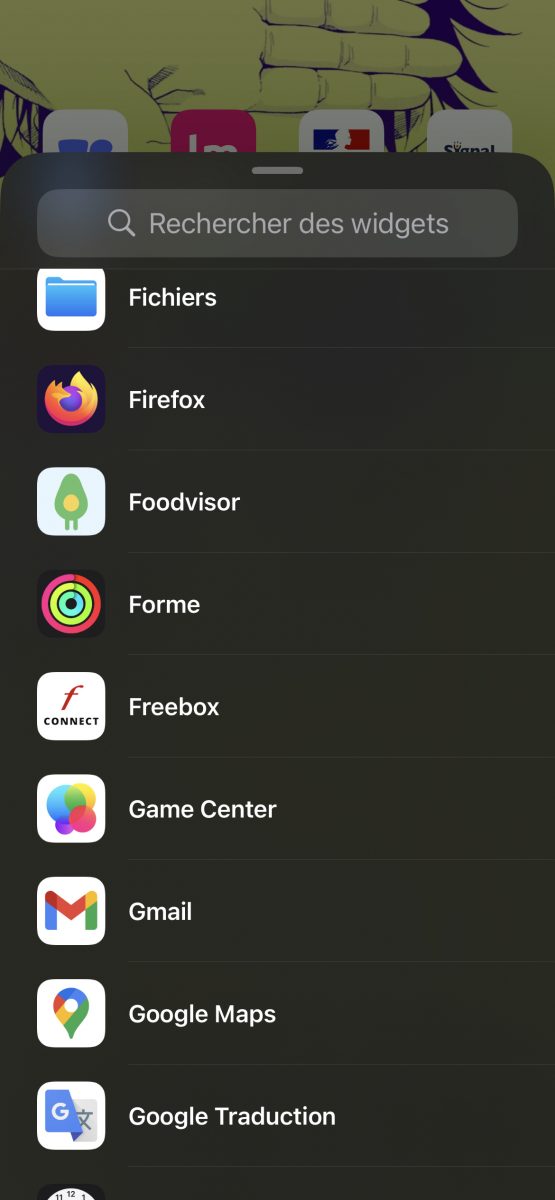 Pour ajouter le raccourci à l’accueil de votre iPhone, la manipulation est assez simple. Il vous suffit de maintenir appuyé votre doigt sur un espace vide de votre écran. Vous aurez ensuite la possibilité d’ajouter un widget en cliquant sur le petit “+” de votre téléphone. Vous aurez alors le choix entre des widgets déjà prévisualisés ou une liste d’application. Faites la défiler pour trouver Freebox Connect, ou utilisez la barre de recherche.