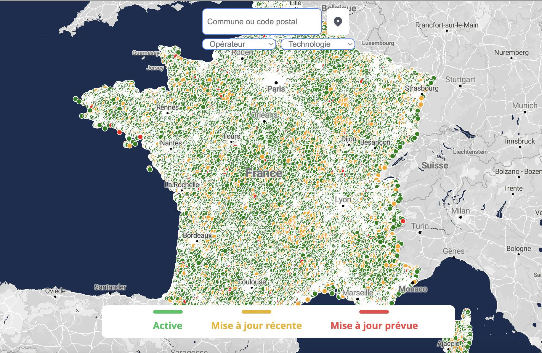 “La carte est organisée autour de 3 couleurs correspondant à 3 statuts. Les pastilles vertes sont des antennes actives en service. Les pastilles orange sont des antennes actives mais qui ont bénéficié d’une mise à jour au cours des 3 derniers mois (nouvel opérateur / nouvelle fréquence par exemple). Les pastilles rouges – plus rares – sont des antennes sur lesquelles les opérateurs ont déclaré à l’ANFR un changement à venir sans que l’on connaisse la date de mise en service (généralement l’arrivée d’une nouvelle fréquence)“, indique DegroupTest. Les données utilisées sur la carte proviennent de l’Agence nationale des Fréquences.