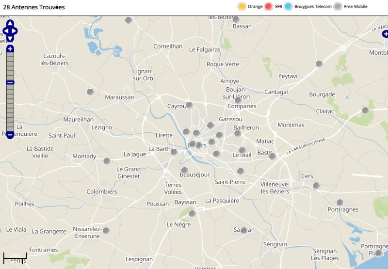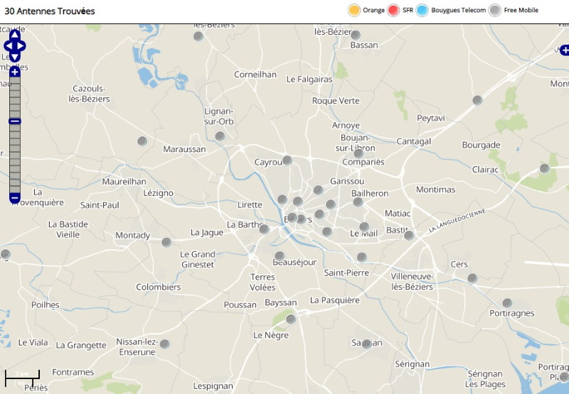 Free a également implanté 15 antennes mobiles 3G dans la ville de Béziers (antennes non-actives incluses).