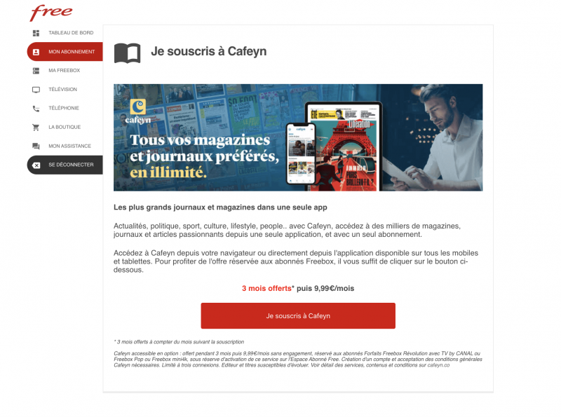Un nouvelle offre réservée aux abonnés Freebox, lesquels peuvent désormais souscrire à Cafeyn sur leur espace abonné. Les trois premiers mois sont offerts sans engagement.