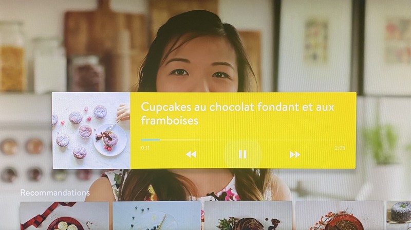 Passons maintenant aux contenus, autrement dit les recettes. Lors de l’ouverture de la recette, la vidéo se lance avec la possibilité d’avancer, de reculer ou de mettre en pause grâce aux boutons en bas de la télécommande. Il ne vous reste qu’à suivre la recette avec des étapes affichées sous la forme de sous-titres. Notez la partie recommandations juste en dessous.