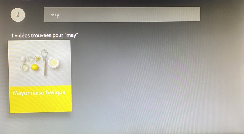 L’interface de l’application est claire et sa prise en main intuitive. Dommage que nous n’ayons pas réussi à utiliser la commande vocale, lors de la recherche de recette. Se servir de la télécommande pour utiliser le clavier virtuel est rarement une partie de plaisir.