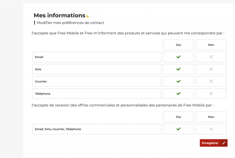 Free Mobile vous demandera dans un premier temps d’accepter ou non d’être informé “des produits et services” qui peuvent vous correspondre, que ce soit par mail, SMS, courrier ou téléphone”, le paramétrage s’effectue alors par item. Dans un second temps, il vous sera demandé d’accepter ou de refuser de recevoir des offres commerciales et personnalisées des partenaires de Free Mobile.