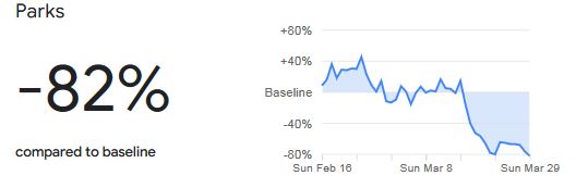 On peut ainsi y voir par exemple qu’en moyenne, en France, la fréquentation des pharmacies et des commerces a baissé de 72% par rapport à la moyenne habituelle depuis le début du confinement, après un pic important. D’autres lieux sont listés, comme les parcs ou les lieux de travail par exemple, dont la fréquentation a baissé respectivement de 82% et 56%.