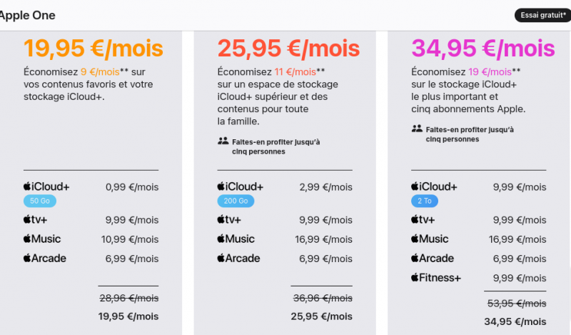 Ce 25 octobre 2023, Apple augmente encore les prix de plusieurs abonnements. Apple TV+ est de nouveau concerné et augmente de 3 euros et coûte désormais 9,99 euros par mois. Cette fois-ci, Apple One et Apple Arcade sont concernés par une augmentation. Le premier augmente de deux euros et sera dorénavant facturé 6,99 euros par mois. Le second augmente de 3 euros peu importe la formule et sera facturé à partir de 19,95 euros par mois pour la formule individuel. Apple One est un abonnement qui regroupe jusqu’à 5 services Apple comme iCloud+, Apple TV+, Apple Music, Apple Arcade ou encore Fitness+.