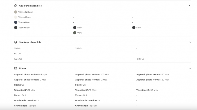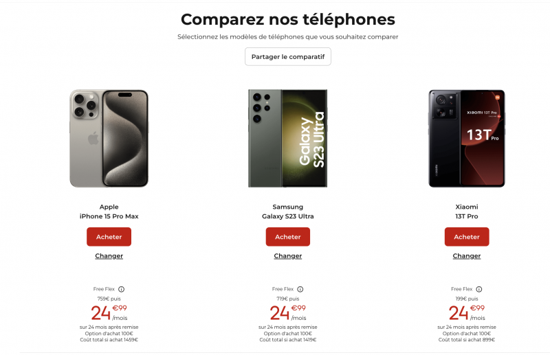 Simple d’utilisation, cet outil permet de sélectionner jusqu’à 3 mobiles que vous souhaitez comparer parmi une large sélection et ainsi découvrir leurs caractéristiques clés. “Explorez les critères de recherche que nous offrons pour trouver le téléphone parfait, taille de l’écran, résolution de l’appareil photo, capacité de la batterie, stockages disponibles, couleurs disponibles”, indique l’opérateur. Pour accéder à ce comparateur, il suffit de cliquer sur “Comparer les téléphones” dans la rubrique “Téléphones & Forfaits” sur le site web de l’oopérateur.