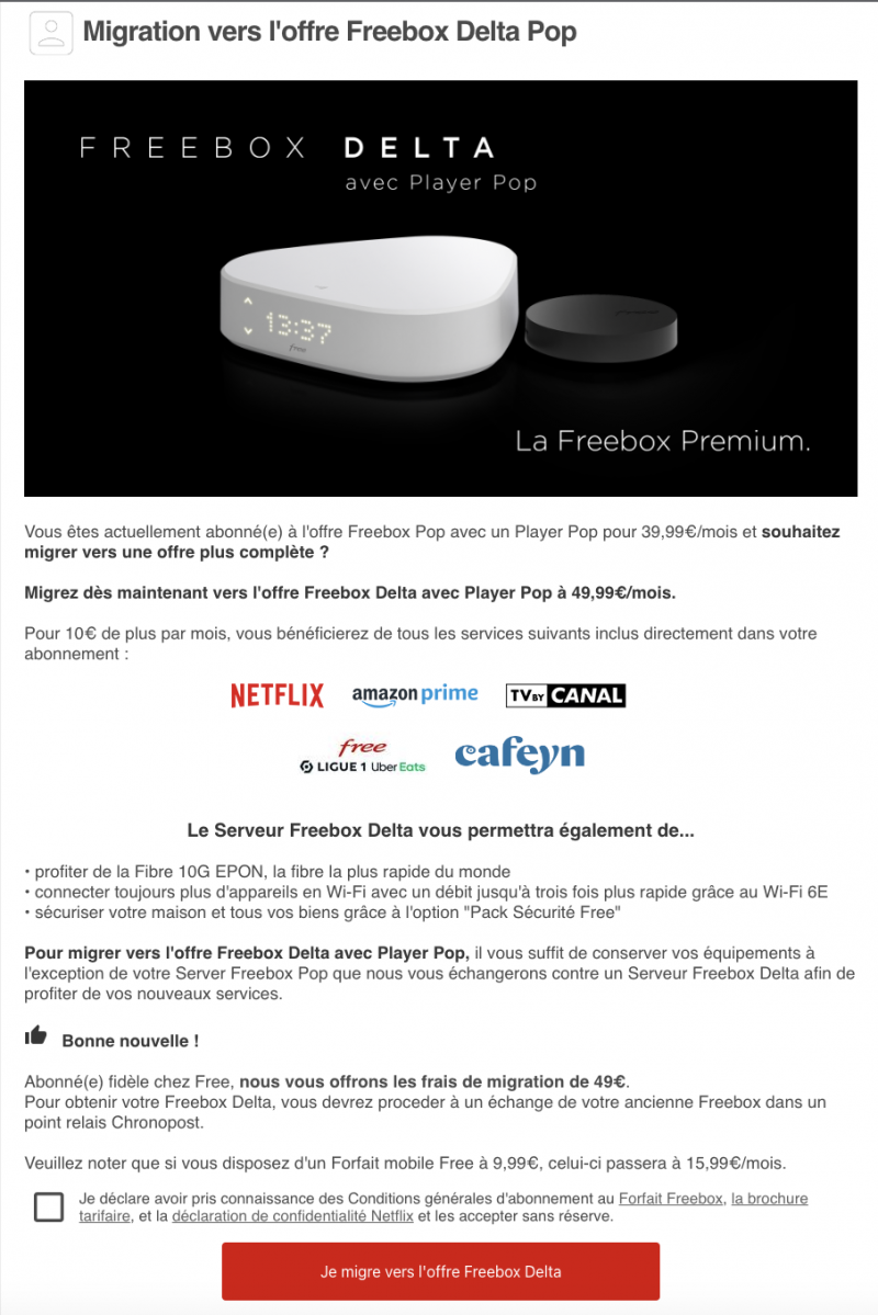 La deuxième condition est d’être un abonné fidèle. En effet, pour remercier ses abonnés de plus de 5 ans, Free leur offre les frais de migrations. Ils basculeront ainsi directement sur l’offre Freebox Delta à 49,99€/mois après avoir procédé à un échange de leur ancienne Freebox dans un point relais Chronopost. Pour les abonnés Freebox Pop, seul le serveur sera à renvoyer. Pour les clients moins anciens, il faudra débourser 49€ de frais de migration.