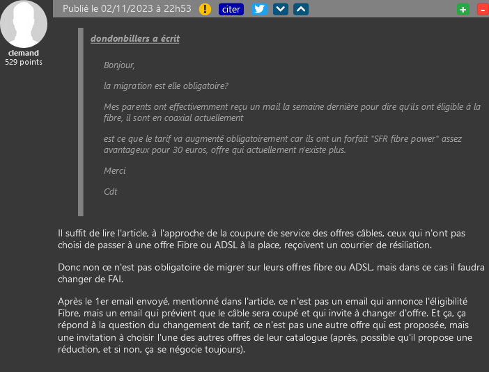 En juillet dernier, certains abonnés disposant d’une connexion passant par le réseau câblé de SFR recevaient des mails les informant de la fin des services de câble coaxial. Dans les environs de Nevers, en Bourgogne-Franche Comté, la connexion a été coupée le 26 octobre dernier mais des abonnés n’ayant pas reçu ou pas lu le mémo envoyé par leur opérateur se retrouvent dans l’embarras. Les offres THD de SFR existent encore à travers l’Hexagone et certains s’inquiètent de se retrouver dans la même situation.