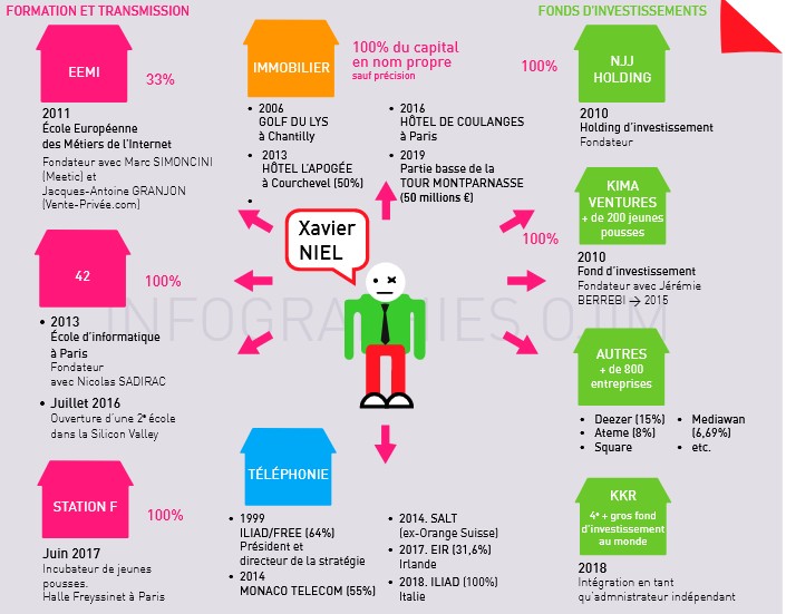 Selon Forbes, Xavier Niel était la 18e fortune française en 2019 avec 3,6 milliards d’euros. Pour se rendre compte de son empire, l’Observatoire du journaliste a réalisé une infographie retraçant l’évolution de l’empire de Xavier Niel au fur et à mesure de ses lancements et ses acquisitions dans le domaine des télécoms, mais également de ceux des médias, de la formation, des startups, de l’immobilier, de la production de contenus et de la musique en ligne.