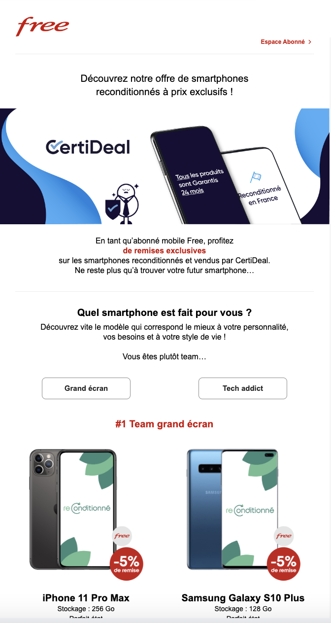 “En tant qu’abonné mobile Free, profitez de remises exclusives sur les smartphones reconditionnés et vendus par CertiDeal. Ne reste plus qu’à trouver votre futur smartphone”, annonce actuellement par mail Free Mobile à certains de ses abonnés.