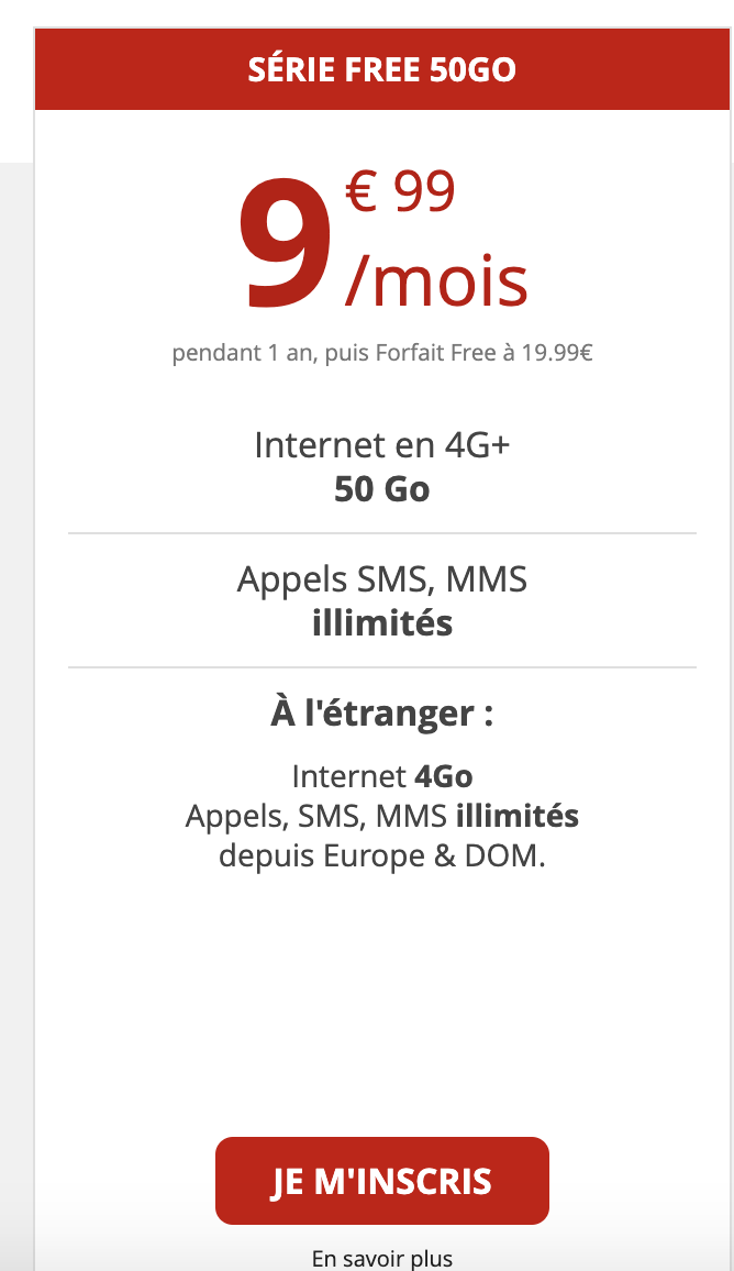 Après avoir augmenté de 10 Go le temps d’une semaine son offre “Série Free”, l’opérateur revient à sa formule habituelle comprenant 50 Go en France métropolitaine à 9,99€/mois pendant un an, sans date de validité pour les nouvelles souscriptions.