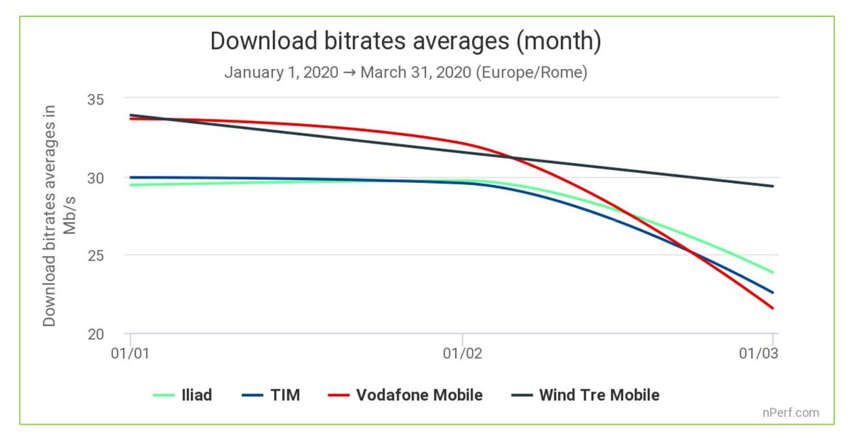 Iliad, comme la majorité de ses concurrents a enregistré des pertes importantes entre février 2020 et mars pour passer d’un débit moyen de 30 Mb/s à moins de 25 Mb/s, il est cependant le deuxième opérateur en terme de débit descendant, derrière Windtre qui est celui qui a enregistré le moins de pertes par rapport au mois précédent, mais dont le débit chute depuis le début de l’année.