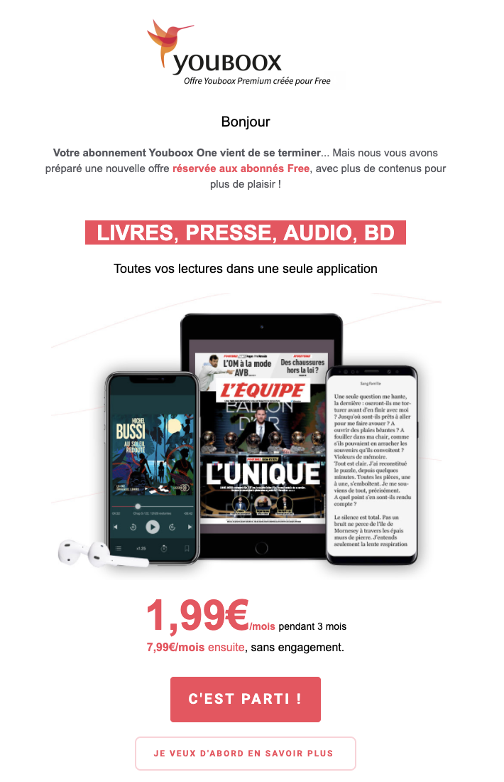“Votre abonnement Youboox One vient de se terminer… Mais nous vous avons préparé une nouvelle offre réservée aux abonnés Free, avec plus de contenus pour plus de plaisir”, tel est le message envoyé par mail depuis hier aux abonnés Free concernés par le service de lecture en streaming. Lancée en janvier 2019, leur offre prend donc fin ainsi que sa gratuité.