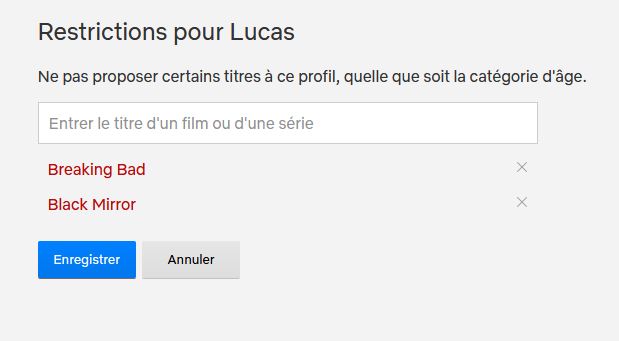 Il faudra vous rendre dans l’onglet de gestion des profils sur navigateur, ou vous pourrez sélectionner celui de votre bambin. Il vous sera alors proposé, comme auparavant, de sélectionner la catégorie d’âge de votre enfant mais également de dresser votre liste de programmes à ne pas proposer.