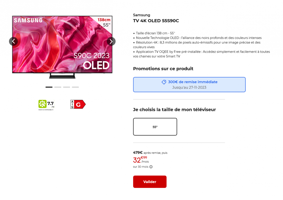 Toutes les technologies sont concernées, tant les téléviseurs QLED que UHD classique, en passant par le modèle OLED. Les promotions sont valables pour tout achat jusqu’au 27 novembre prochain. Pour le seul téléviseur OLED proposé par Free, vous pouvez ainsi bénéficier d’une remise de 300€ immédiate, permettant ainsi une commande à 479€ puis 32.99€/mois pendant trente mois.