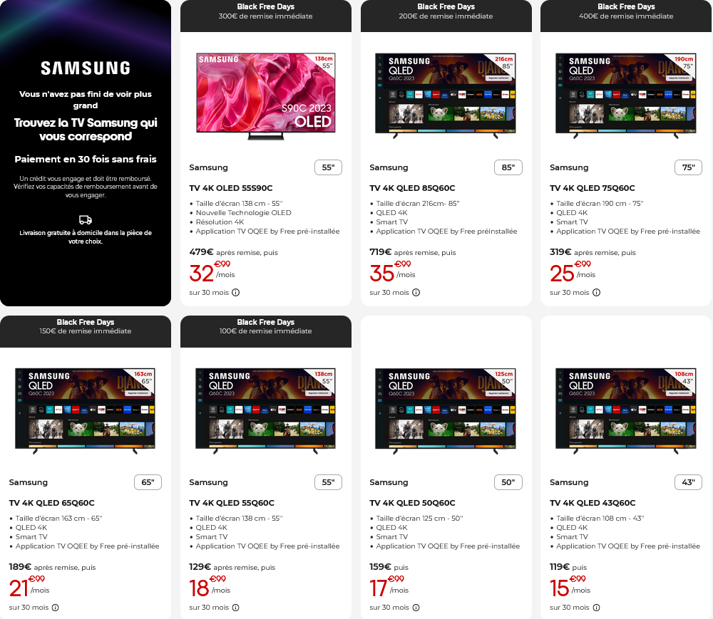 Les Black Free Days ne sont pas réservés aux smartphones. Depuis votre espace abonné, dans la section TV, vous pouvez retrouver la boutique dédiée à l’achat de téléviseurs connectés Samsung et plusieurs offres ont été lancées. Contrairement aux promotions proposées sur la boutique Free Mobile, il s’agit ici exclusivement de remise immédiate, pour une économie dès la commande.