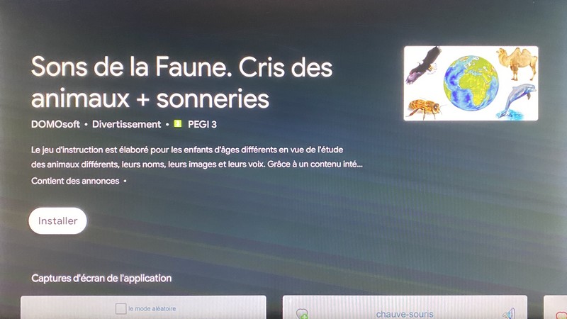 Disponible sur le Play Store de la Freebox mini 4K, “Les sons de la faune” est une application qui permet de faire découvrir aux enfants les sons de la faune, les sons de 80 représentants de la faune mondiale.