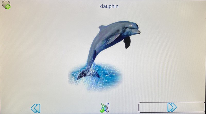 Les fiches comportent une photo de l’animal avec son nom juste au-dessus. Le son est lu automatiquement et peut-être réécouté avec le bouton en dédié, en position centrale.