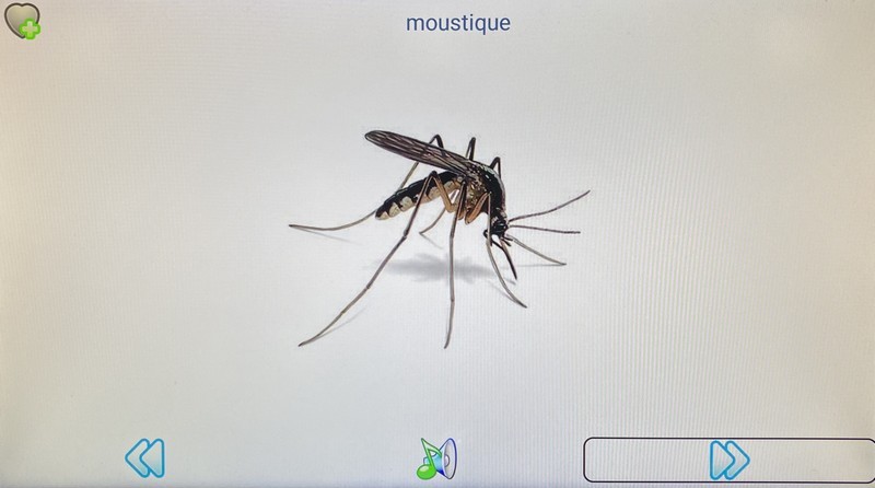 Les enfants entendront ainsi des bruits qui leur sont ou leur deviendront peut-être vite familiers comme le chat, le chien, le pigeon, la vache ou le canard, et d’autres au contraire dont ils se passeront bien comme le moustique.