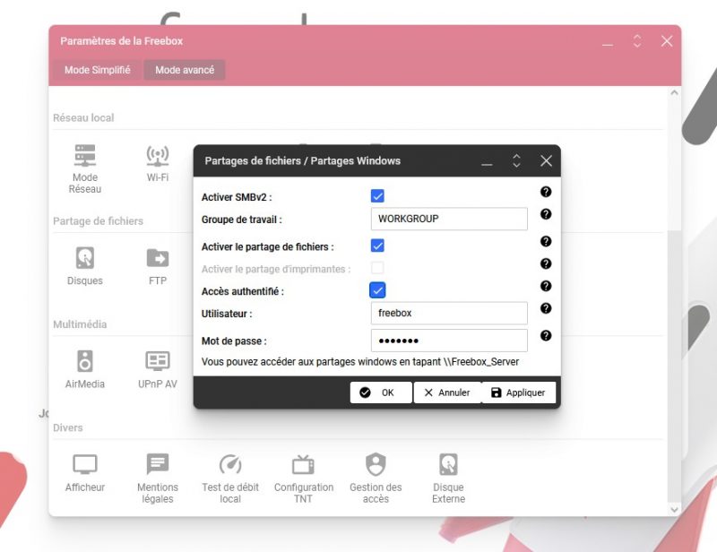 Ouvrez tout d’abord votre navigateur Web et accéder à Freebox OS en saisissant l’adresse http://mafreebox.freebox.fr/. Accédez ensuite aux “Paramètres de la Freebox” et au “mode avancé”. Restera ensuite à se rendre “Partages Windows” ou “Partages MacOS). Pour notre exemple, notre utiliserons un serveur Freebox Delta et un ordinateur sous Windows. Pour les abonnés Mini 4K, One et Pop, vous devrez connecter un support de stockage externe si vous souhaitez profiter de cette option puisque ces box n’intégrèrent pas de disque dur, a contrario de la Freebox Révolution.