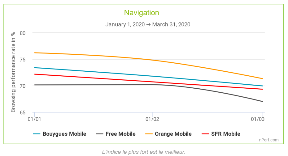 Entre le mois de février et le mois de mars, on peut noter une perte de débit descendant de 4Mb/s en moyenne pour les opérateurs, ce qui reste “très acceptable” indique le rapport. Côté navigation, la baisse est plus nette pour tout le monde avec une baisse de trois points en moyenne en un mois. Orange et Free sont d’ailleurs les plus pénalisés.