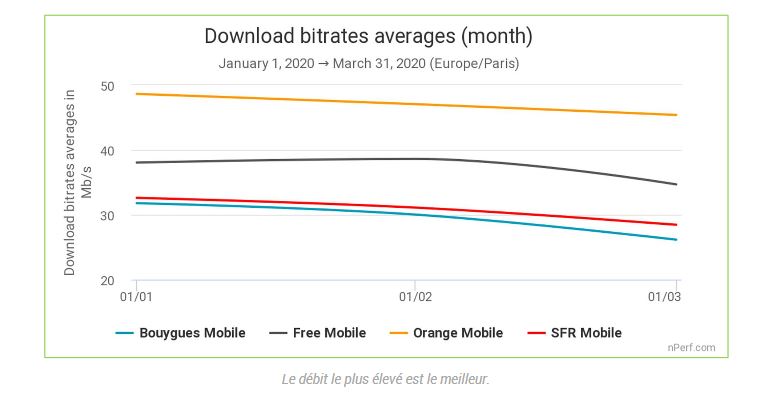 Le baromètre de nPerf indique une baisse générale d’au maximum de 10% entre février et mars, une variation estimée légère chez les quatre opérateurs.L’impact du confinement est notamment visible au niveau des débits descendants et de la navigation.