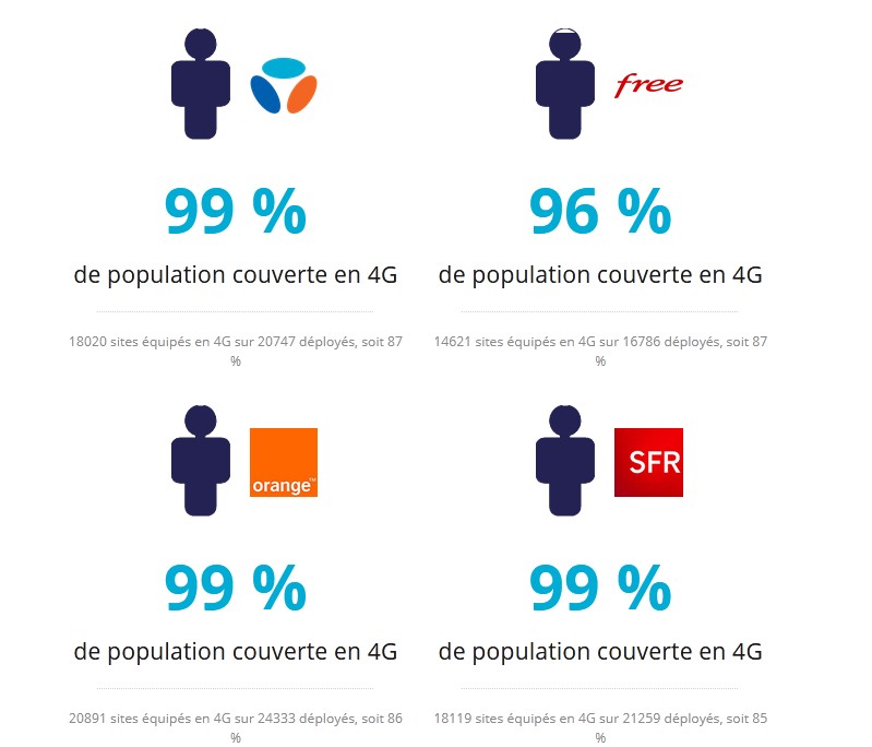 Concernant la 3G, Orange Bouygues et SFR ont une couverture supérieure à 99 % de la population, tandis que Free atteint les 98 %. En couverture du territoire, Orange Bouygues et SFR ne sont pas très éloignés, avec un taux qui oscille entre 93 et 97 %. Free est dernière avec 83 %. Pour sa 3G, Free a d’ailleurs prolongé le contrat d’itinérance avec Orange et fait évoluer cette itinérance grâce au réseau 208.16.