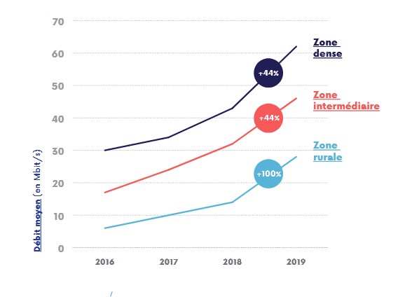 Le New Deal prévoit par ailleurs une amélioration des débits Internet mobiles. En 2019, le débit descendant moyen en France Métropolitaine atteignait les 45 Mbit/s. Dans le détail, l’Arcep note une progression de + 44 % en zone dense, + 44 % en zone intermédiaire et + 100 % en zone rurale. En zone rurale, le débit moyen a donc doublé.