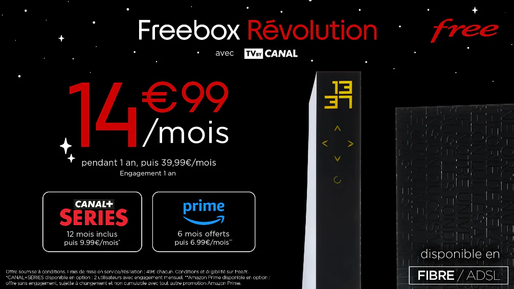 La bonne affaire du moment pour bénéficier de la Freebox mythique. L’abonnement Freebox Révolution avec TV by Canal est proposé à 14.99€/mois pendant un an avec un engagement d’un an. L’offre, qui inclut également Canal+ Séries pendant 12 mois et l’intégralité des services Amazon Prime pendant six mois, est disponible jusqu’au 18 décembre, à 6h du matin. Ce n’est pas la meilleure offre proposée sur Veepee, puisqu’elle ne permet que d’économiser 5€/mois la première année (contre 10€/mois pour de précédentes promos) mais elle permet de bénéficier de 5€/mois de réduction également pour toutes les années suivantes, par rapport au tarif affiché sur le site de l’opérateur.