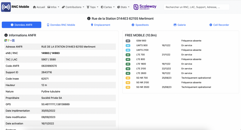 Si les bornes de Stations-e disposant d’une antenne tube n’accueillent pas toutes à l’heure actuelle la 4G des opérateurs, certaines hébergent les équipements de Free Mobile, en atteste notre partenaire RNC Mobile et sa communauté de chasseurs d’antennes. C’est le cas notamment dans la commune de Merlimont dans le département du Pas-de-Calais en région Hauts-de-France. Toutes les fréquences 4G de l’opérateur sont actives.