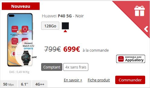 Vous pouvez dès à présent vous procurer le Huawei P40, dans son coloris noir, qui est disponible pour 699€ contre 799€ auparavant. En quatre fois sans frais, vous devrez vous acquitter de 177€ puis 174€ sans frais.