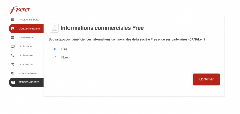 Du leur côté, les abonnés Freebox doivent se rendre dans la rubrique “Mon Abonnement” de leur espace client, puis ” Mes informations personnelles”. A contrario de Free Mobile, le FAI met tous les oeufs dans le même panier : “souhaitez-vous bénéficier des informations commerciales de Free et ses partenaires (Canal+)”, questionne-t-il. Pour ceux qui souhaiteraient recevoir uniquement les offres de l’opérateur, Free prévoit de mettre en place prochainement le même paramétrage que sur son espace abonné Free Mobile. Les informations commerciales de ses partenaires seront ainsi dissociées.