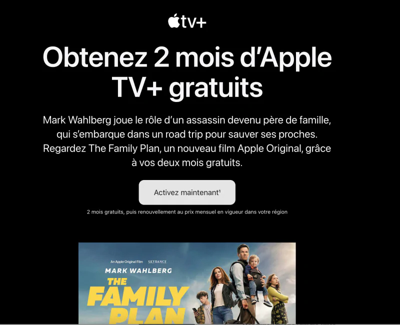 Après avoir augmentée de 3€ son abonnement à Apple TV+ en octobre dernier, la firme de Cupertino offre actuellement 2 mois d’accès à sa plateforme et son catalogue à l’occasion de la sortie de The Family Plan avec Mark Wahlberg dans le rôle d’un assassin devenu père de famille, qui s’embarque dans un road trip pour sauver ses proches.