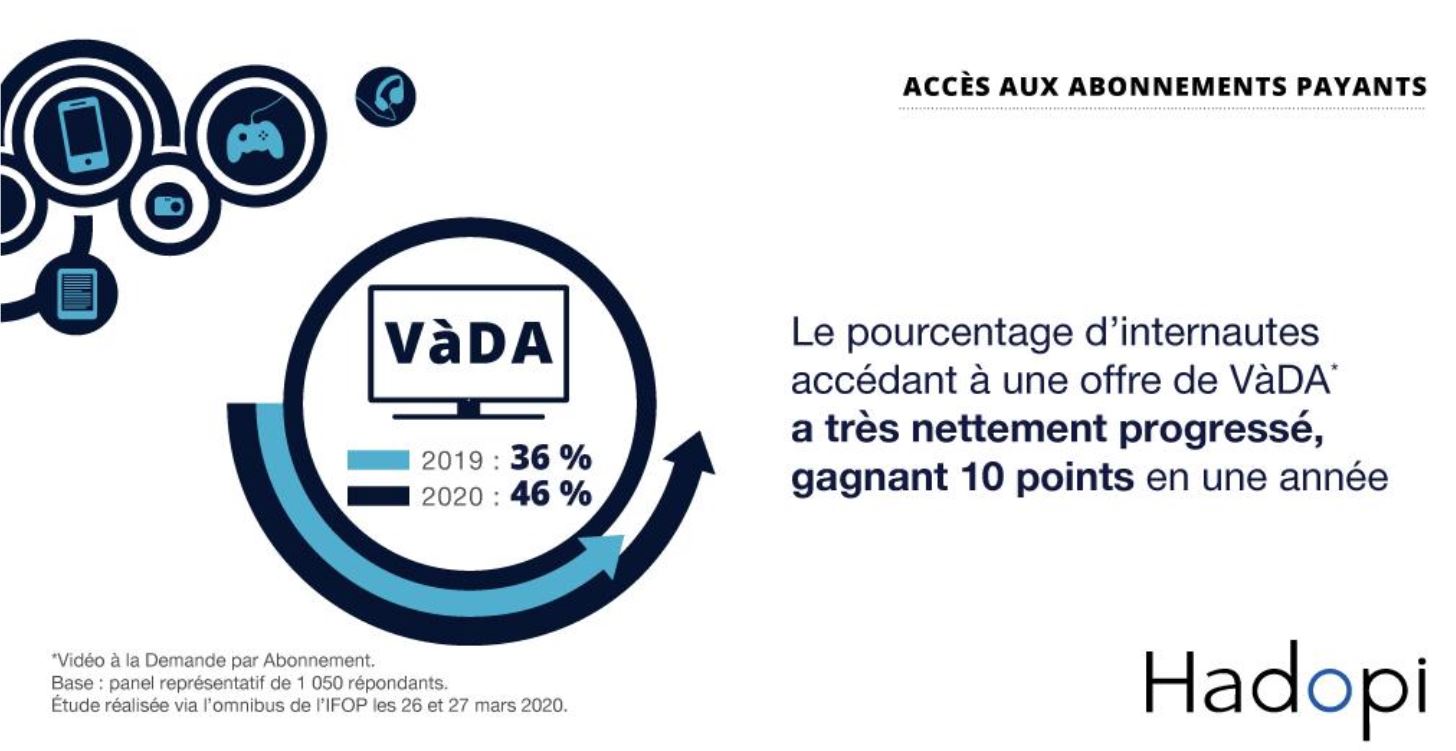 Dans une étude IFOP initiée par l’Hadopi ayant interrogé un échantillon représentatif de la population de l’Hexagone durant la période du 26 au 27 mars 2020, on constate que 46% des internautes français déclarent accéder à un abonnement payant de vidéo à la demande pendant le confinement. A titre de comparaison, en 2019, le pourcentage était de 36%.