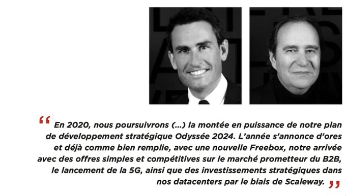 En 2020, nous poursuivrons aussi la montée en puissance de notre plan de développement stratégique Odyssée 2024. L’année s’annonce d’ores et déjà comme bien remplie, avec une nouvelle Freebox, notre arrivée avec des offres simples et compétitives sur le marché prometteur du B2B, le lancement de la 5G, ainsi que des investissements stratégiques dans nos datacenters par le biais de Scaleway