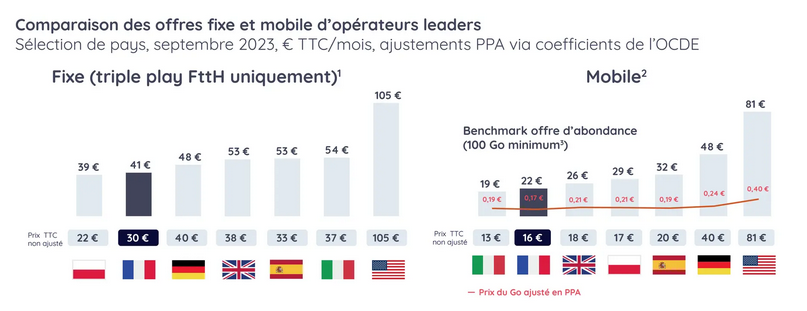 La FFT entend également montrer que les investissements réalisés par le secteur des télécoms depuis 5 ans (14,6 milliards en 2022) sont bien plus importants que ceux des autres réseaux d’infrastructures français, 2 fois supérieurs aux investissements réalisés dans le transport et la distribution d’électricité ou dans le réseau ferré, 8 fois supérieurs aux investissements autoroutiers. “Chaque année, depuis 5 ans, les opérateurs investissent l’équivalent de 1,7 fois le budget des Jeux Olympiques de Paris 2024” indique la Fédération. L’effort d’investissement des opérateurs français représente près de 20% du CA, soit près de 150 euros par habitant.