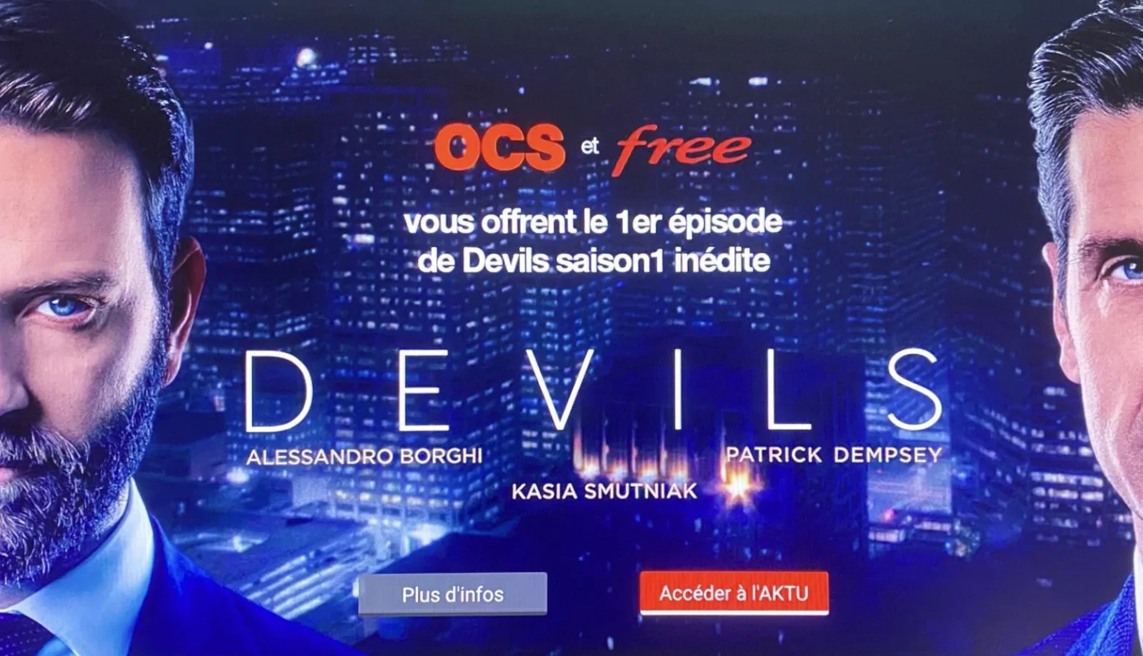 Diffusée en exclusivité sur OCS Max (canal 37) depuis ce week-end, “Devils” est une série ambitieuse sur le monde de la finance sous forme de thriller avec Patrick Dempsey l’ancienne star « Grey’s Anatomy » dans le rôle d’un banquier sans scrupules. La saison 1 compte 10 épisodes, le premier est aujourd’hui offert par OCS et Free en version SD et HD. Pour y accéder, il suffit de vous rendre dans la rubrique “Aktu Free” de votre Freebox, de cliquer sur l’offre idoine, puis, “voir la vidéo”.