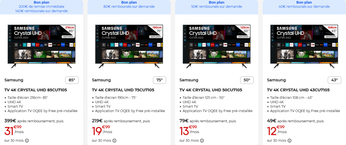 De quoi faire des économies en ce début d’année. Plusieurs offres de remboursement ont été lancées ce mardi 2 janvier et sont proposées jusqu’au 15 janvier dans la boutique Smart TV dédiée aux abonnés Freebox. Elle concerne la gamme Crystal UHD qui est la moins onéreuse parmi les modèles proposés chez Free.