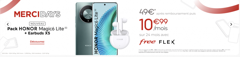 Xiaomi est aussi de la partie, son 12T bénéficie d’une offre de remboursement de 110€. Honor n’est pas en reste non plus avec notamment une réduction sur le Pack Honor Magic6 Lite + Earbuds X5. Au total, près de 45 références de smartphones de grands fabricants bénéficient de promotions dans la boutique en ligne de l’opérateur. Les abonnés Free Mobile bénéficient parfois d’offres différentes et plus avantageuses que les non-abonnés.