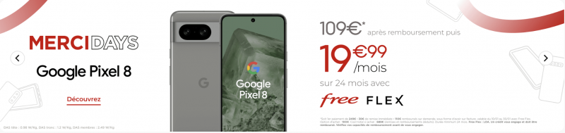 Le Razr 40 Ultra bénéficie quant à lui d’une réduction de 200€ comme le Galaxy S23+. Le Google Pixel 8 pro voit son prix baisser de 110€ sur demande avec en plus 80€ de remise immédiate. Idem pour le Pixel 8 pour l’ODR avec une réduction immédiate de 30€.