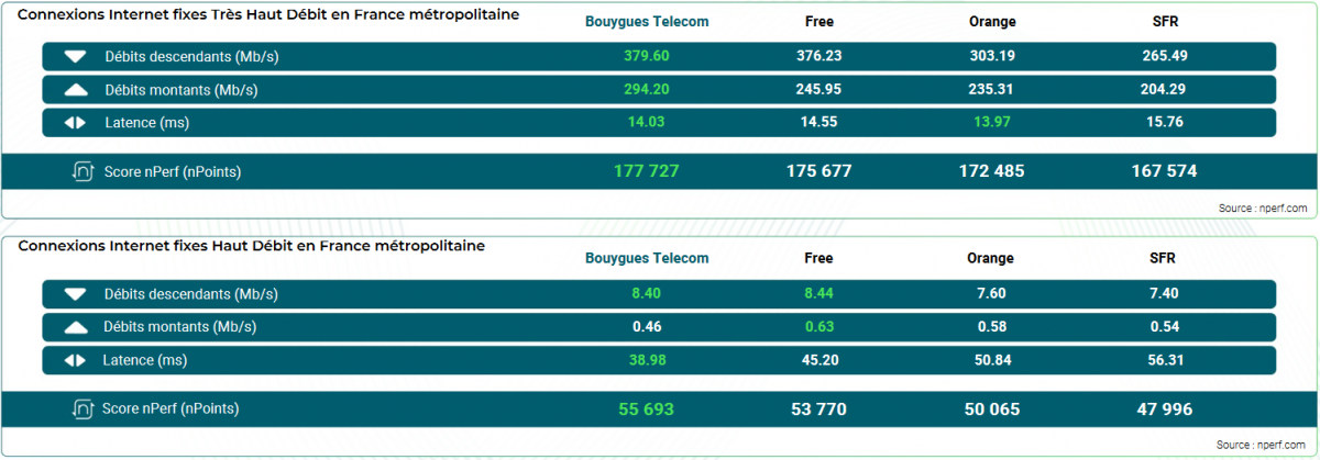 On peut noter que sur les connexions Haut Débit (ADSL et Câble allant jusqu’à 30 Mb/s en download) mesurées, Free et Bouygues Telecom sont tout de même au coude à coude, et si ce dernier propose une meilleure latence, c’est Free qui l’emporte de peu sur les débits. Si Free est qualifié de “en retard” par nPerf,il est souligné que “la Freebox v9, annoncée comme étant compatible avec le Wi-Fi 7, participera à l’amélioration des débits des utilisateurs équipés“.