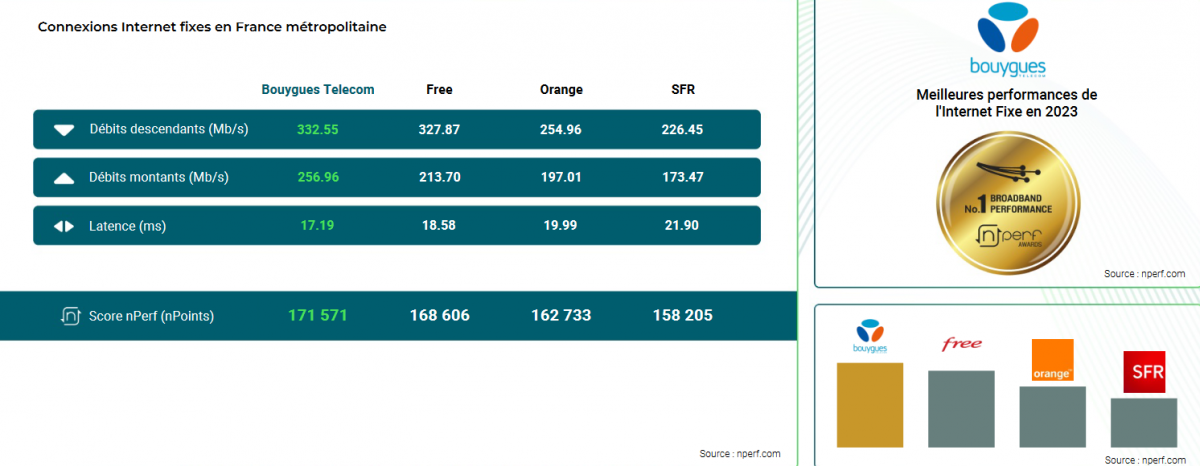 Une performance permise, selon l’outil de mesure de débits, par les investissements dans les réseaux et dans les équipements de ses clients avec des box équipées de WiFi 6 et 6E et lui permet ainsi de prendre l’avantage sur les débits descendants, montants et même la latence. En 2023, les quatre opérateurs français ont continué à améliorer les performances de leurs réseaux et ont proposé des connexions Internet plus performantes : +20% de débit descendant, +21% de débit montant, ainsi que -9% de latence.