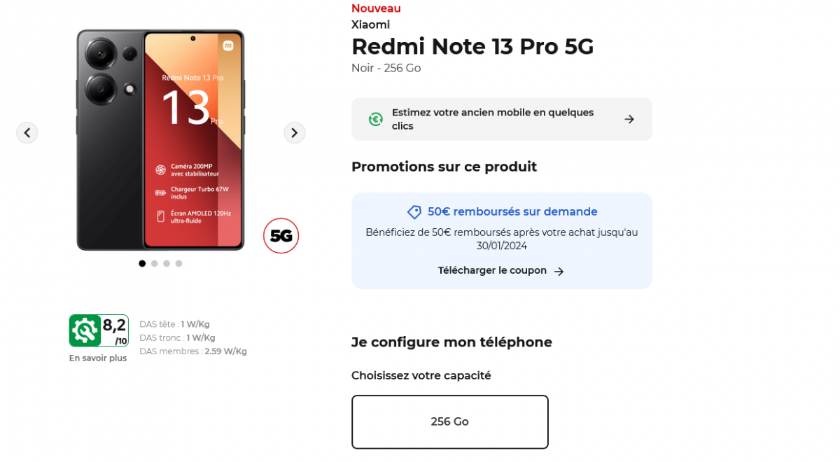 Le Xiaomi Redmi Note 13 Pro 5G est ainsi proposé à 399€ avec une offre de remboursement de 60€ sous forme d’avoir si vous n’êtes pas abonné ou 50€ si vous êtes abonné , avec 256 Go de stockage dans son coloris noir. Il est possible d’échelonner le paiement via Free Flex, avec un premier versement de 99€ puis des mensualités de 10.99€ pendant 24 mois et une option d’achat de 36€. Pour les personnes étant connectés avec leurs identifiants Free Mobile, le smartphone passe à 389€ au comptant. En passant par Free Flex, vous réglez 51€ à la commande puis 12.99€/mois avec une option d’achat de 26€.