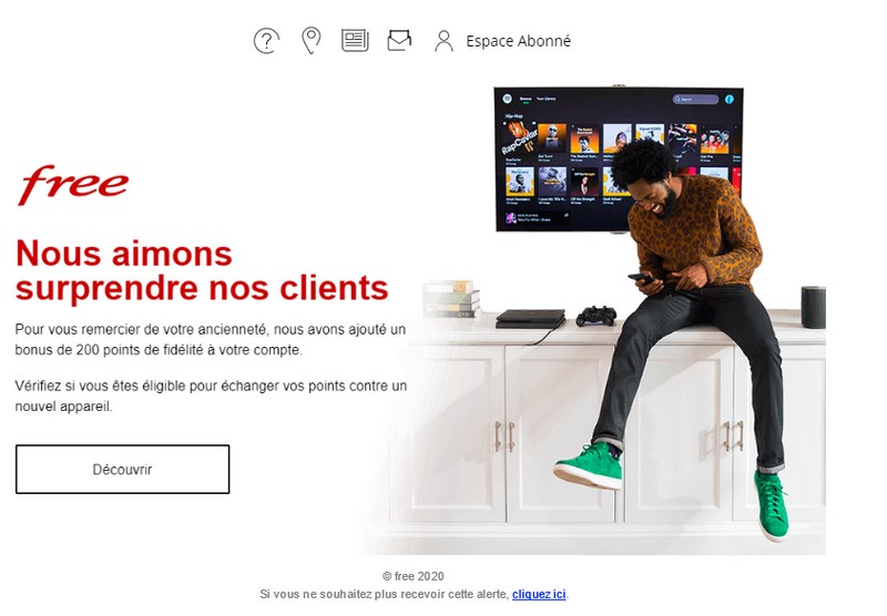 Se faisant passer pour Free, un escroc envoie un e-mail avec la promesse d’un bonus de 200 points pour remercier les clients de leur ancienneté. Ces clients sont aussi invités à cliquer pour voir ce que permettent de s’offrir les points cumulés.