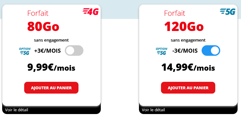 En effet, pas d’offre exclusivement 5G, mais des forfaits à 9.99€/mois et 11.99€/mois avec respectivement 80 et 120 Go, auxquels vous pouvez greffer la nouvelle génération de téléphonie mobile moyennant 3€ supplémentaires chaque mois.