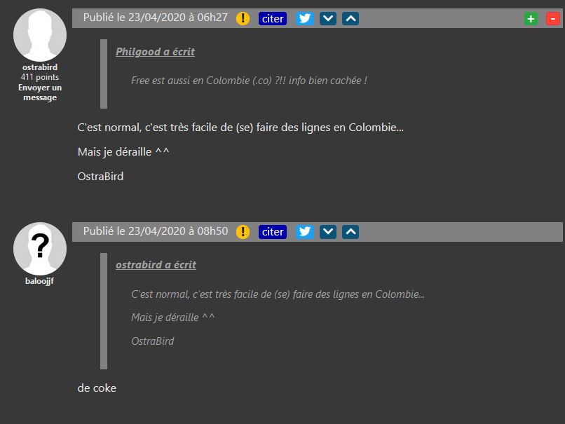 Les phishings chez Free sont souvent réalisés avec des adresses provenant de l’étranger, pour éviter aux arnaqueurs d’être retrouvés facilement. Dans l’un d’entre eux qui annonce à l’abonné qu’il a gagné des “points fidélités”, l’adresse se trouve en Colombie. Le pays, bien connu pour ses problèmes de drogue, a inspiré quelques jeux de mots savoureux de la part d’ostrabird.