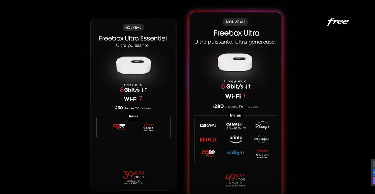 On y découvre d’ailleurs officiellement ce qui était supposé suite à la keynote de ce matin : les Freebox Ultra sont uniquement disponibles pour les abonnés fibre.