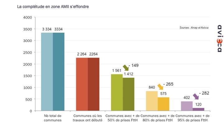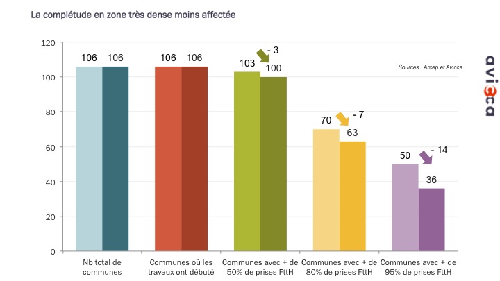 En Zone très dense, on compte “un peu plus de trois cent mille locaux supplémentaires“, d’après l’AVICCA. Cependant, la complétude est moins affectée, le nombre de commune entièrement (ou presque) raccordables à la fibre optique recule de 28%. La progression reste correcte à quelques exceptions près. Par exemple, Venissieux qui faisait partie des grandes villes les moins bien raccordées à la fibre optique, l’impact est dur : le taux de complétude passe de 60% à 40% avec ce nouveau référentiel.